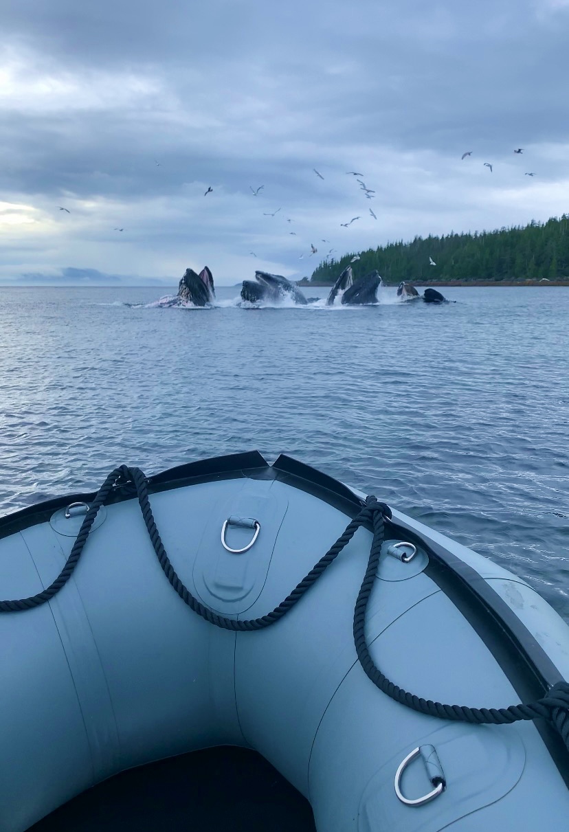 At the Ketchikan Kayak Company, we’re only interested in experiences where you, the guests, can take control and do the piloting, paddling or peddling. There are many Ketchikan boat tours that allow you to just ride along, this isn’t one of them! Small groups of up to 3 inflatable boats follow a guide boat through the rugged coastal islands of Southeast Alaska. Your guide will introduce you to a bald eagles nest, and explore the protected waterways of the Tongass Narrows with you seeking out resident seals and sea lions, inter tidal creatures such as sea stars and hopefully, everyone’s favorite, humpback whales or migrating Orca pods! While we can never guarantee whale sightings on any given tour and every season varies, the Tongass Narrows is often a hot spot for Humpbacks feeding on Herring each summer and migrating up to Juneau and back, as well as pods of resident Orca hunting schools of salmon. Zipping around in zodiac boats allows us to go to where the whales may be that day.